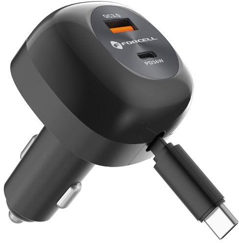 Forcell F-ENERGY Alu autós töltő visszahúzható kábellel C típusú és C típusú + USB-A aljzat PD QC4.0 SFC2.0 3A 75W fekete