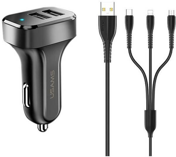 Usams C13 2x USB Type-A Autós töltő + 3in1 USB Type-C / Lightning / Micro USB Type-B kábel - Fekete (5V / 2.1A) (USA000623) (USA000623)
