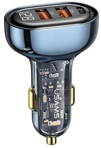 USAMS autós töltő 1xUSB-C 2xUSB-A 125W gyorstöltéssel átlátszó-kék